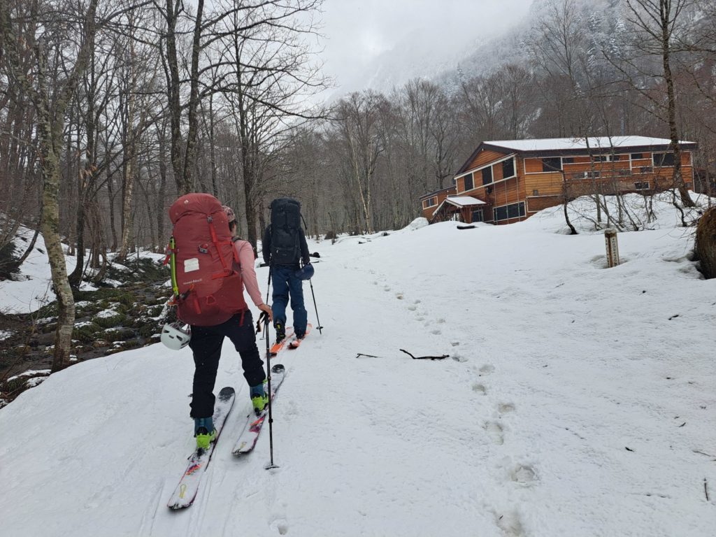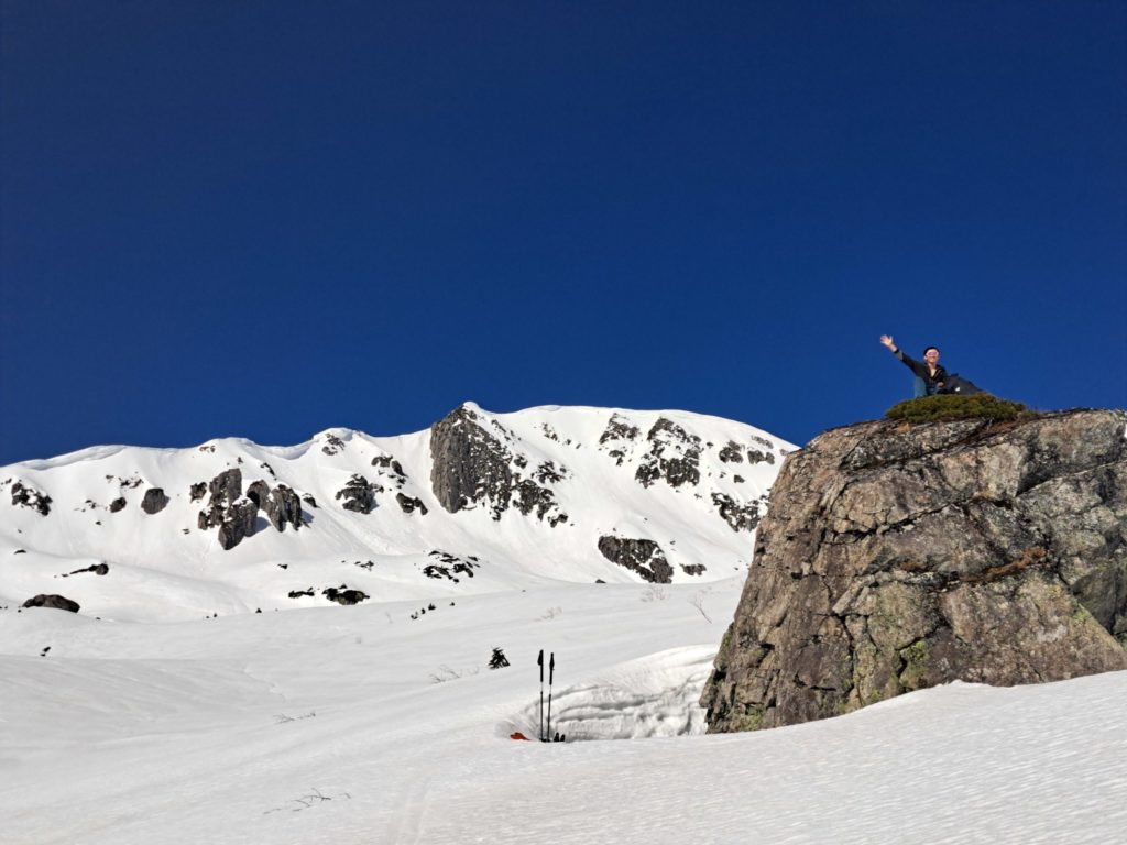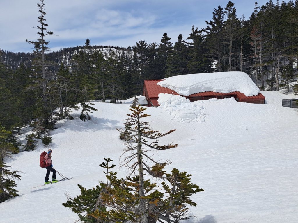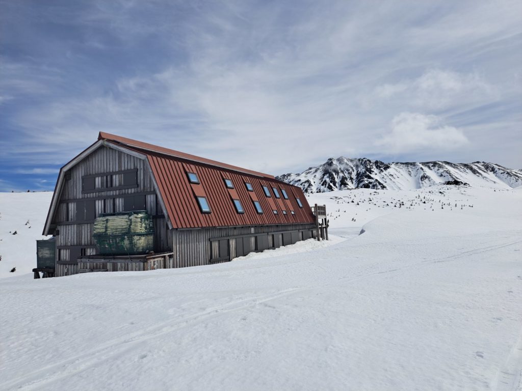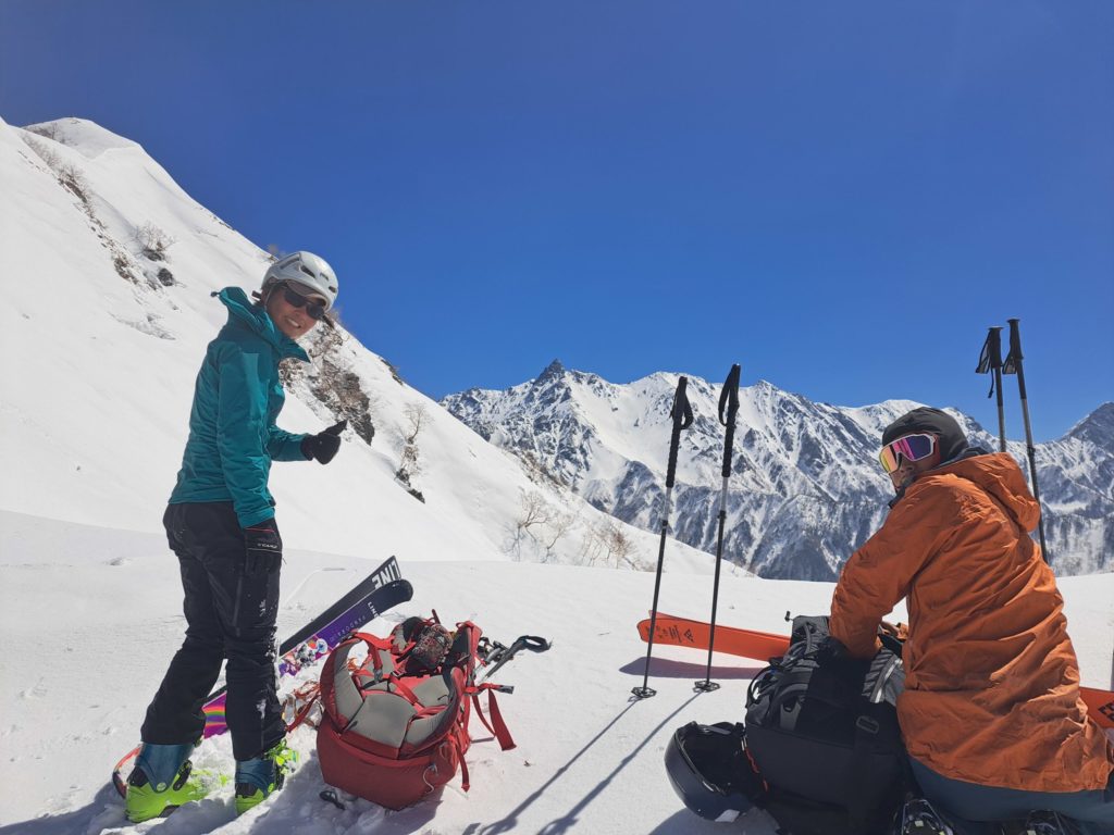 全員集まった所で五郎小舎に向けてグループラン。少し固めのザラメはよく滑り、メローな斜面なのにスピードが出て気持ちいい。最高のロングランができ、稜線から小舎まで10分程で着いた。