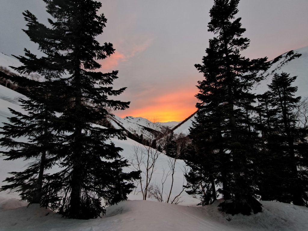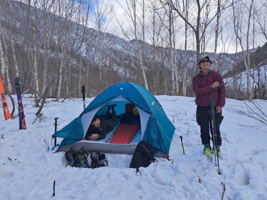 気持ちのいいザラメを滑走し、リグループ。そのままテントに向けて一気に滑り、本日の大冒険を終えた。