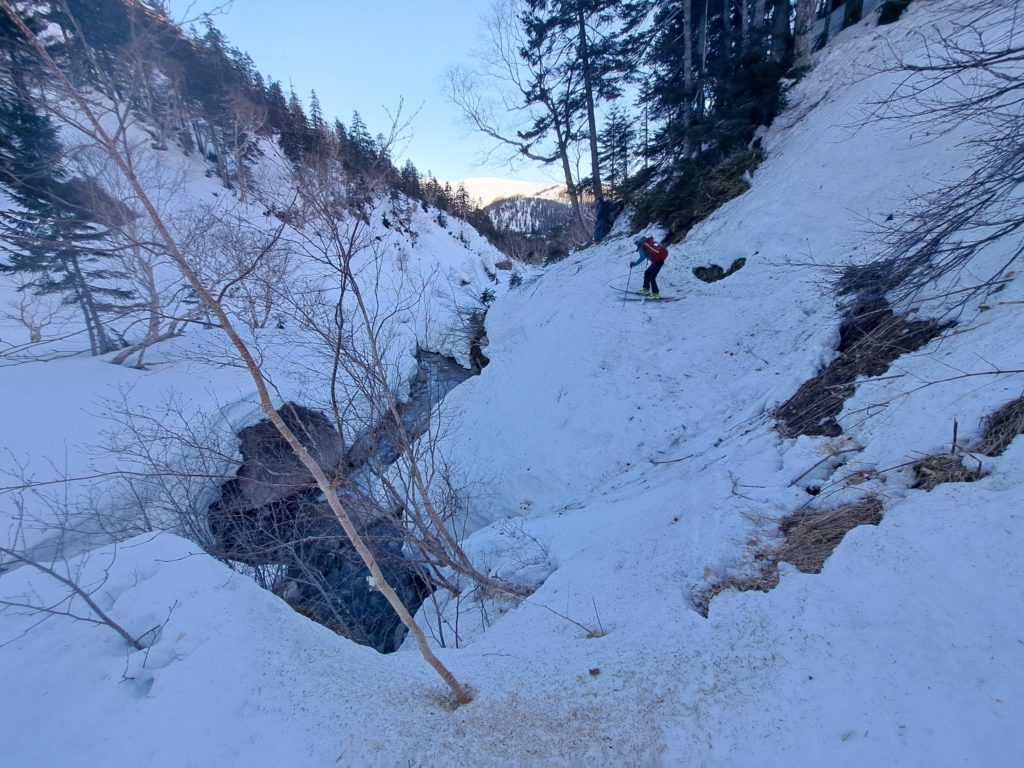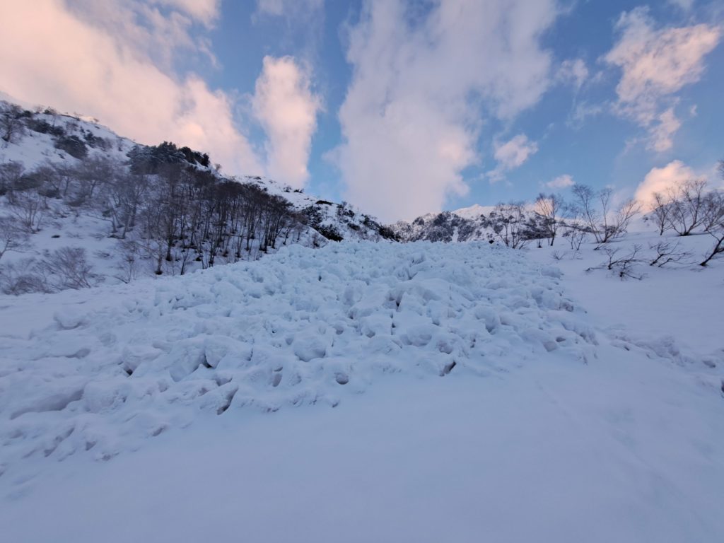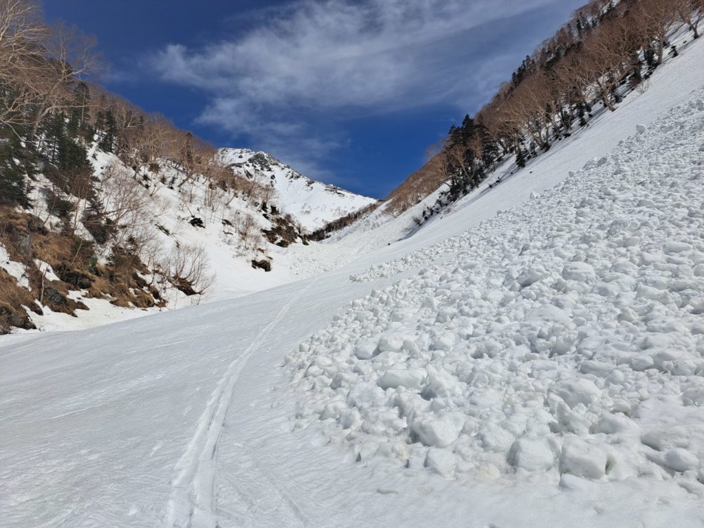 更に沢まで落とすと祖父岳からの雪崩で全滅する可能性がある。場所選びは本当に難しい。