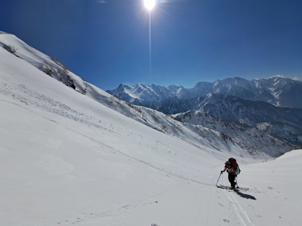 五郎沢を下ると帰りが大変になるので、北斜面を滑って黒部源頭に落とす。