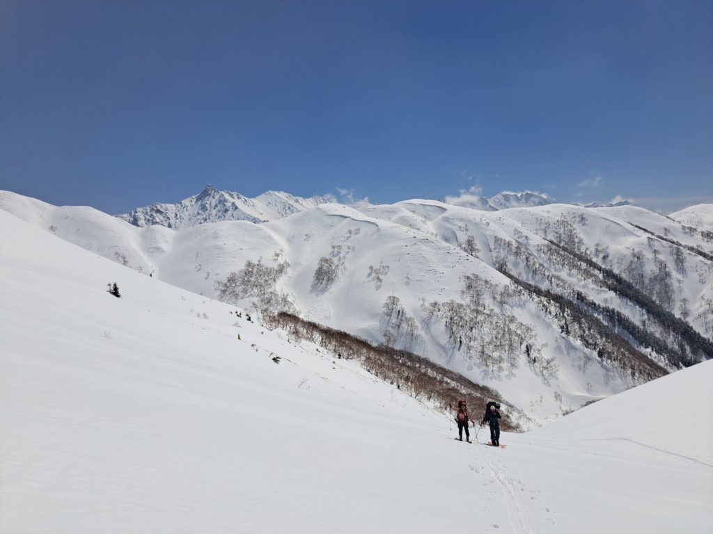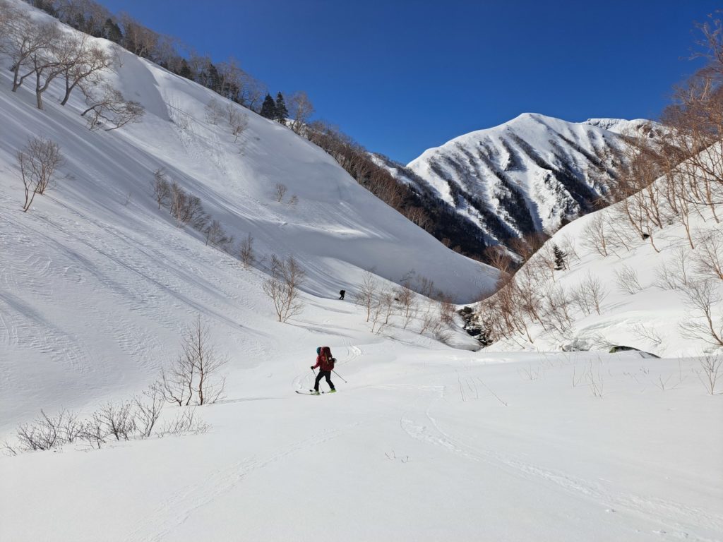 双六沢左岸を登る。雪も緩んで登りやすく快晴。