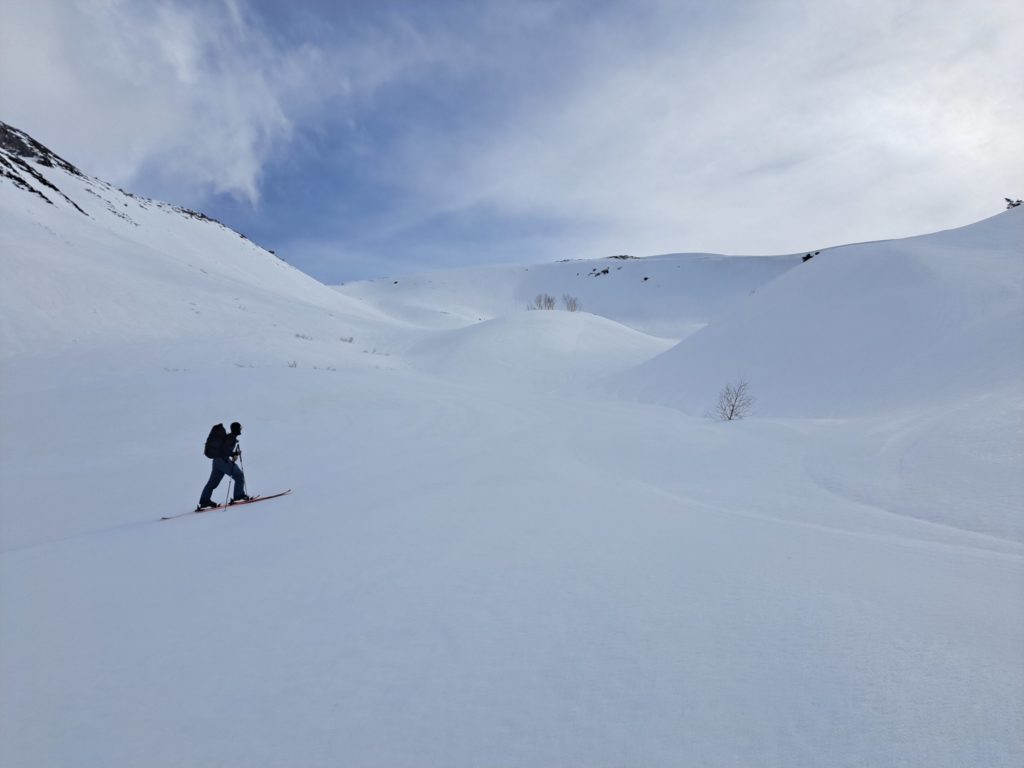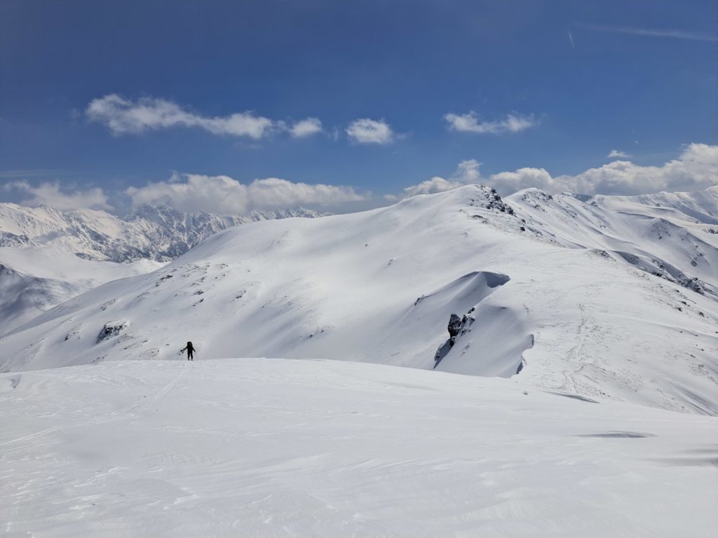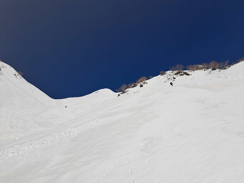 今回の山行では最も大きいカールだろう。魅力的な滑走ラインが何本も見え、どこを滑っても楽しそうである。