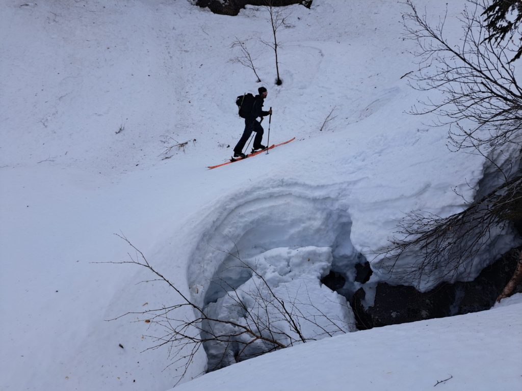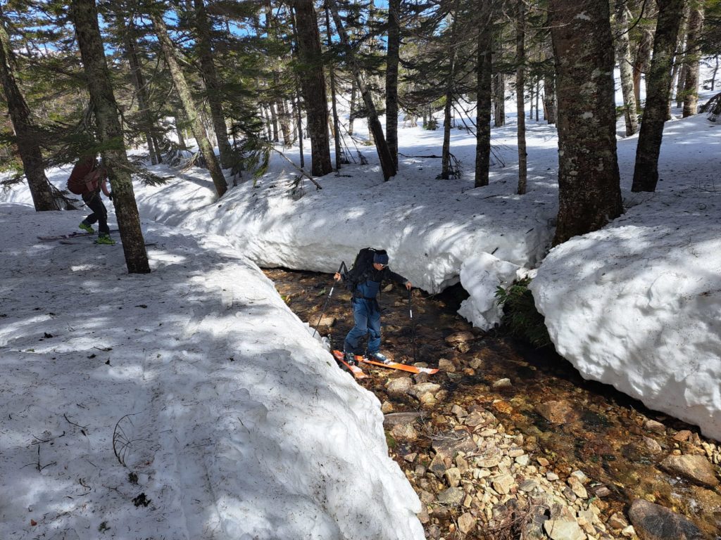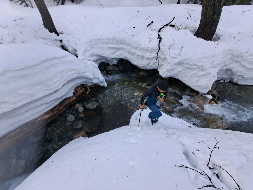 祖父平で中州に入ってしまった為、スノーブリッジを渡渉、落ちたら雪解け水にドボンだ。
