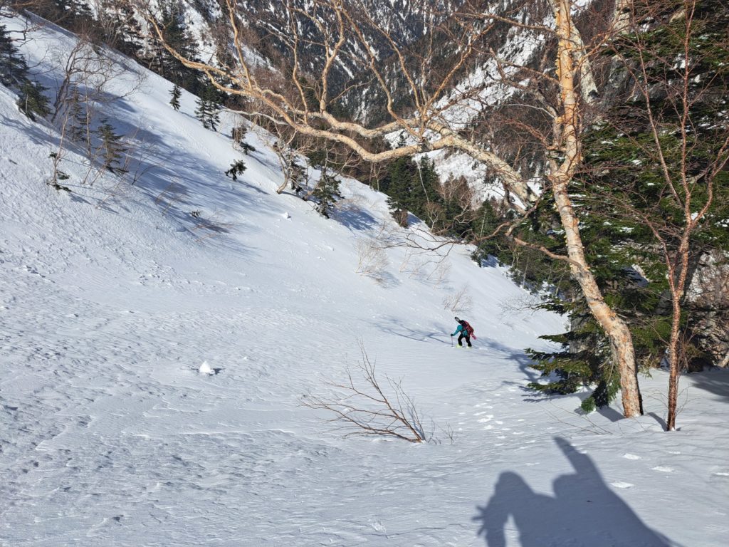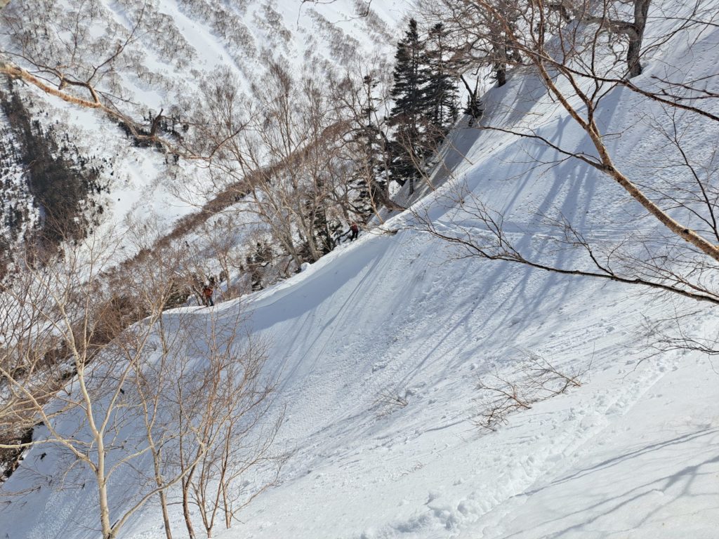 3本目の沢でドロップし、左にトラバース。ピカリンの見事なルーファイで、事無きを得た。