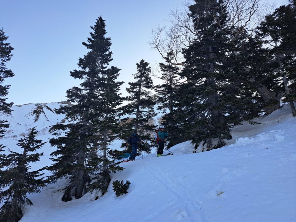 ここはコルまで戻り夏道沿いを滑る事にした。