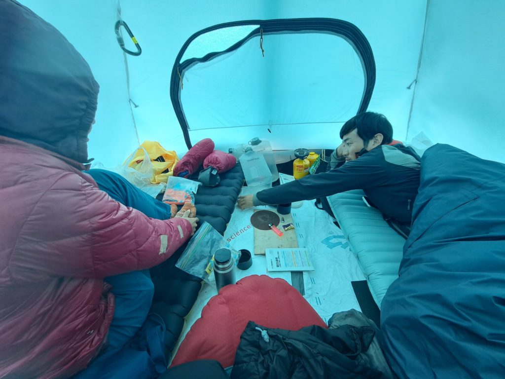 テント内はカリカリになっており、霜取りから朝が始まる。