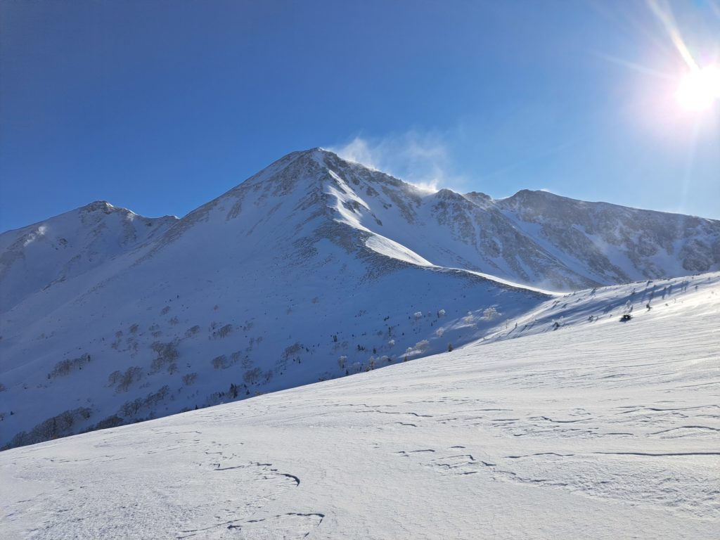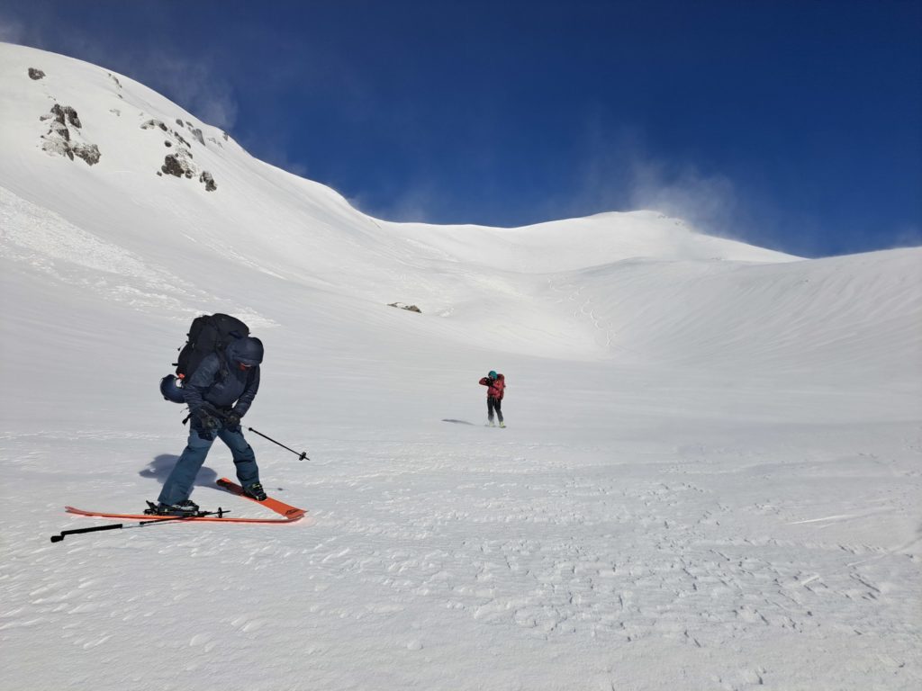 カール内を奥まで歩き、山頂の少し右の斜面を登る。かなり急なので途中から板を脱ぎ、シートラに切り替えた。