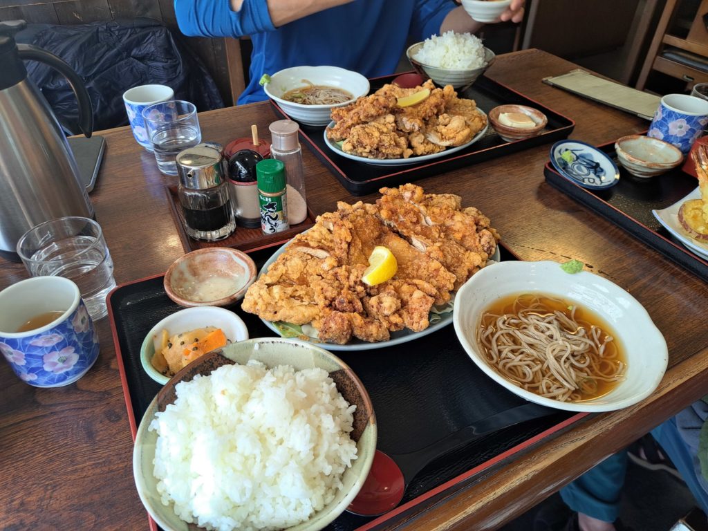 平湯温泉で汗を流し、松本の蕎麦屋「松花」で山賊焼き定食を注文。