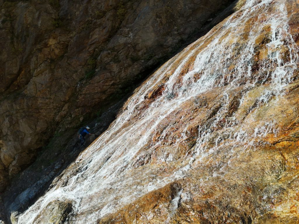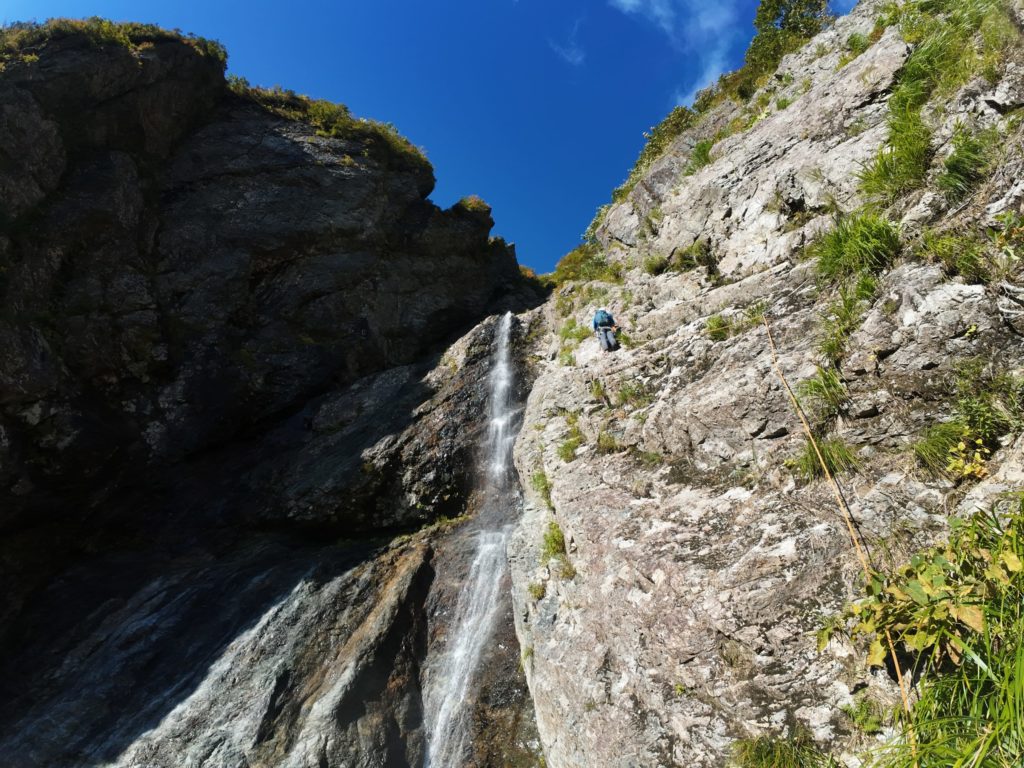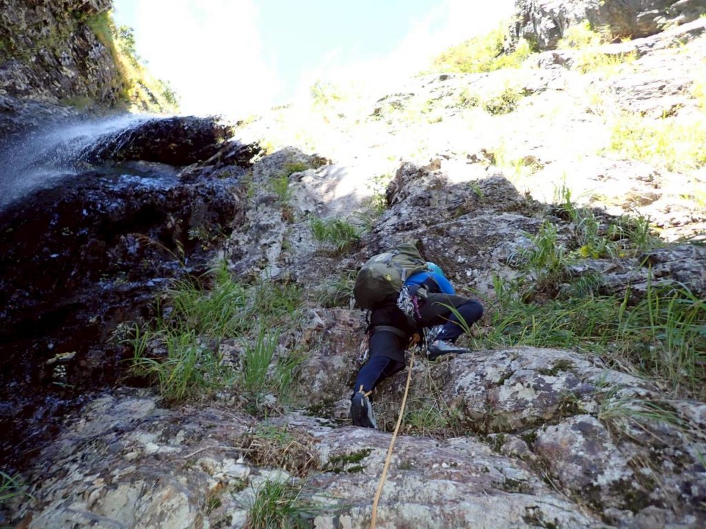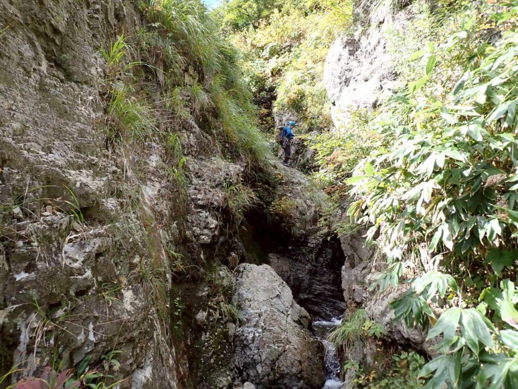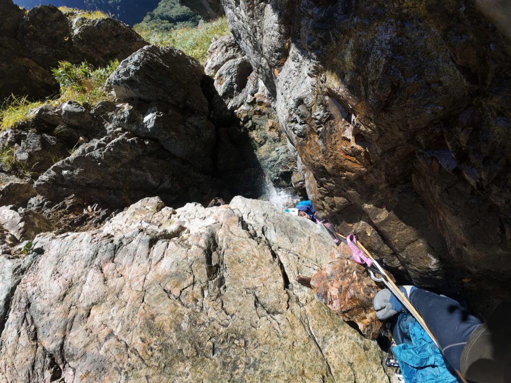 次はロープなしで行けるかと思ったが、微妙に悪いのでロープ継続。右のルンゼを登って沢床へ。