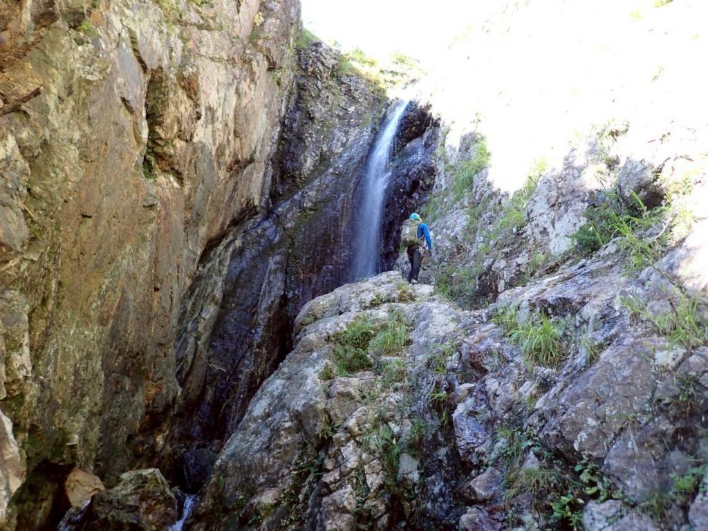 ここで選択肢は二つ。右のルンゼから登るか、滝の右壁を登るか。後者は明らかに悪いが、テラスの上にあるため5Mほど高度を稼げる。対して前者は簡単そうだが距離が長くなり、最悪変な方向に導かれる可能性がある。