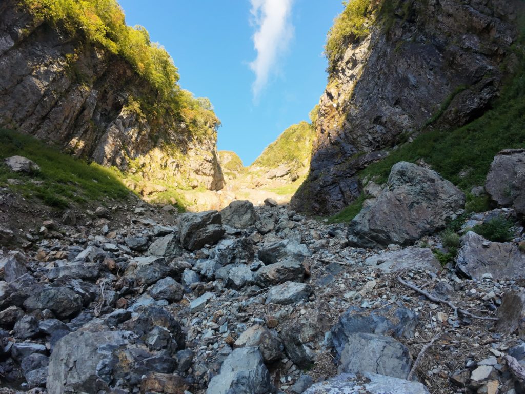 すぐに広めのゴルジュ地形になる。以前はこの辺りにも滝があったようだが、ガレキに埋まってしまったらしい。