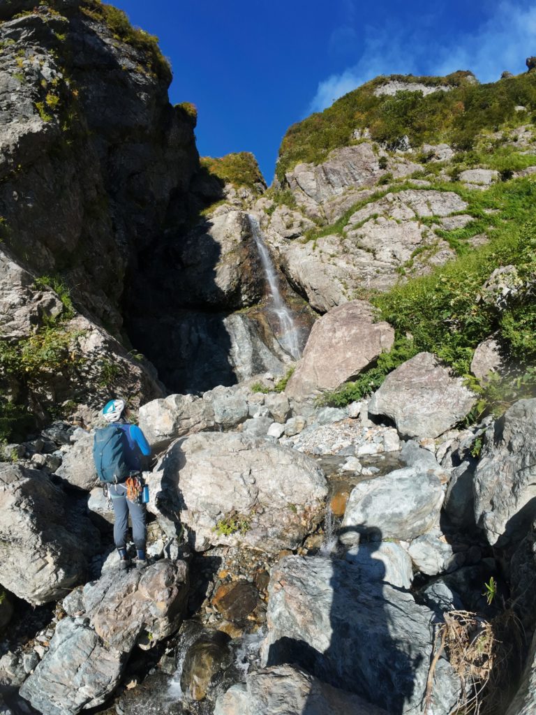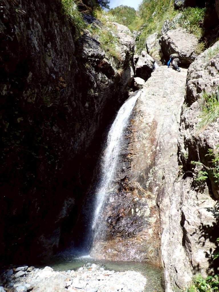 この沢の特徴として滑りやすい蛇紋岩と外傾したホールドがあり、下から見ると簡単に見えても登ってみるととにかく滑る。