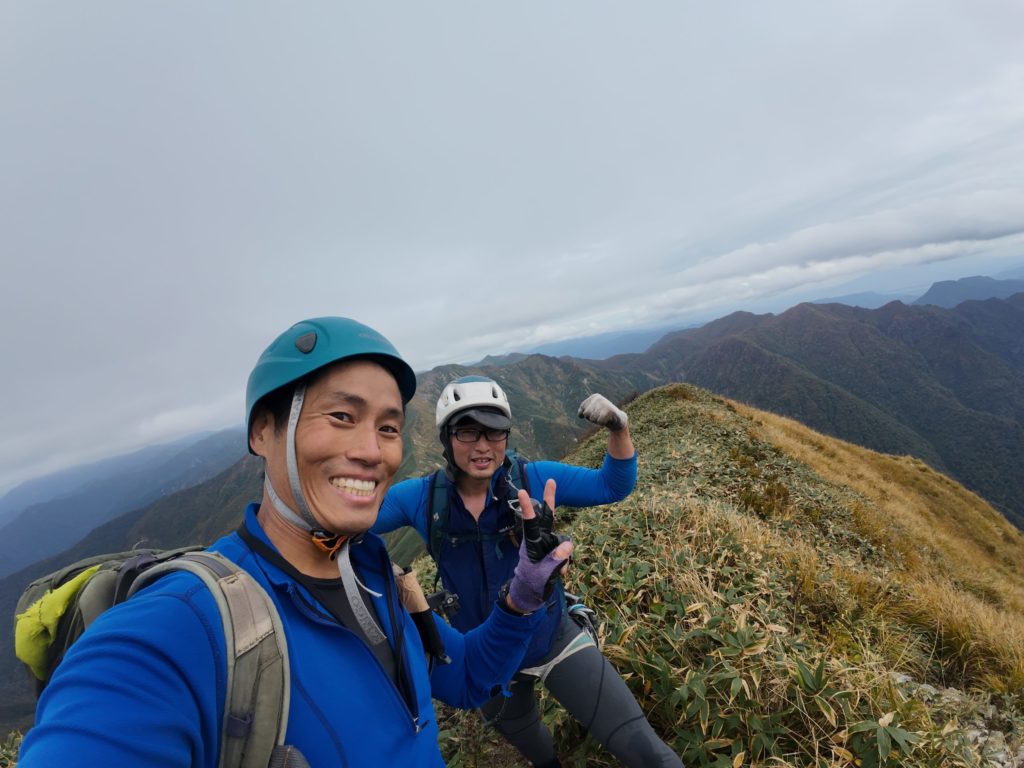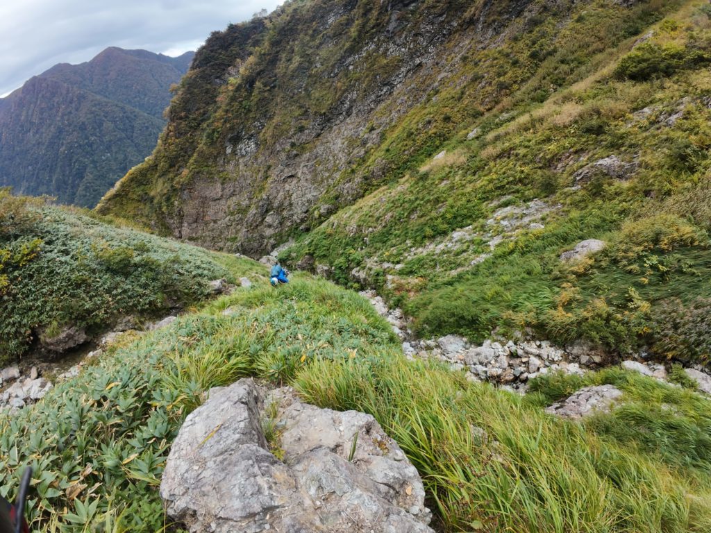 何とか小指程度の灌木にたどり着き、ハングを左にトラバース。強引なハイステップといつ崩壊するか分からない岩にレイバックをし、泣きそうになりながら登る。