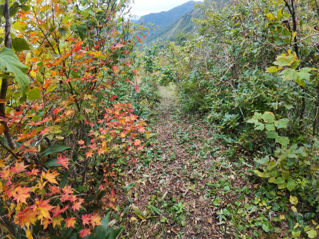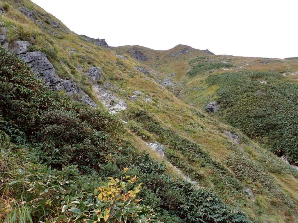 気付いたら草付きの尾根に乗っており、ただの藪漕ぎになってしまった。