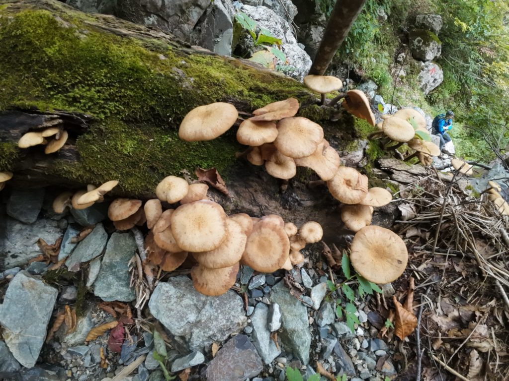 ただ下るだけだと面白くないのでキノコ採り。ミズナラの倒木に「ナラタケ」が生えてました。天気が良かったので悪くない出来です。