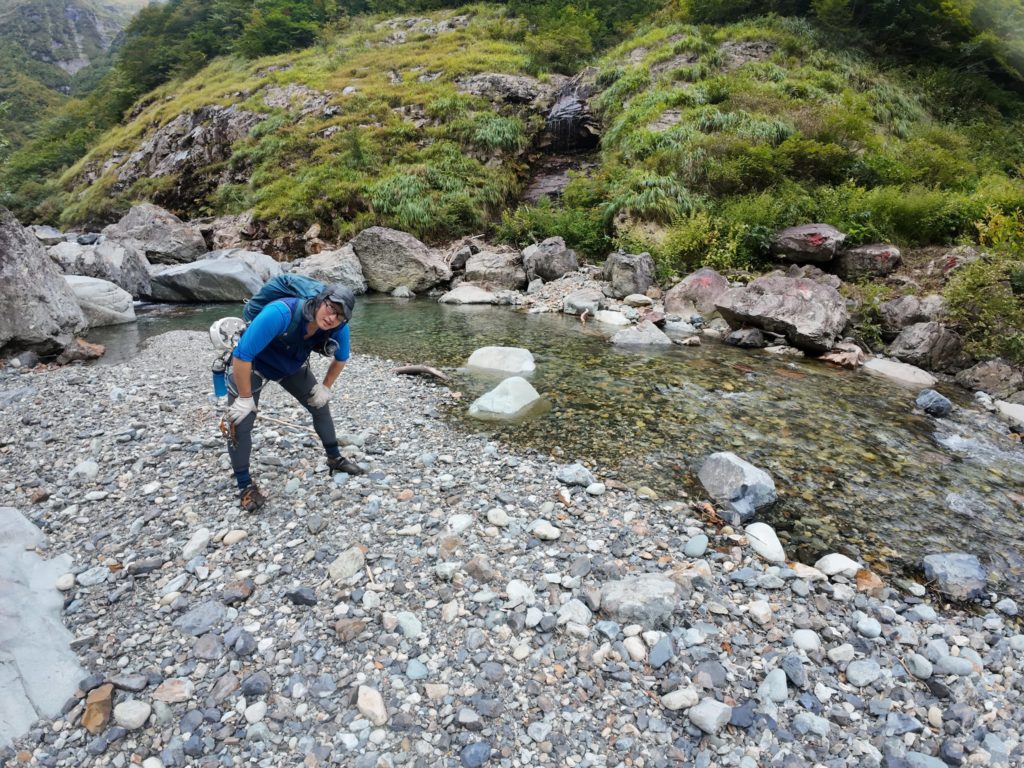 空はすっかり明るくなり、沢靴に履き替える。下山もここを通るので、アプローチシューズは置いていきます。