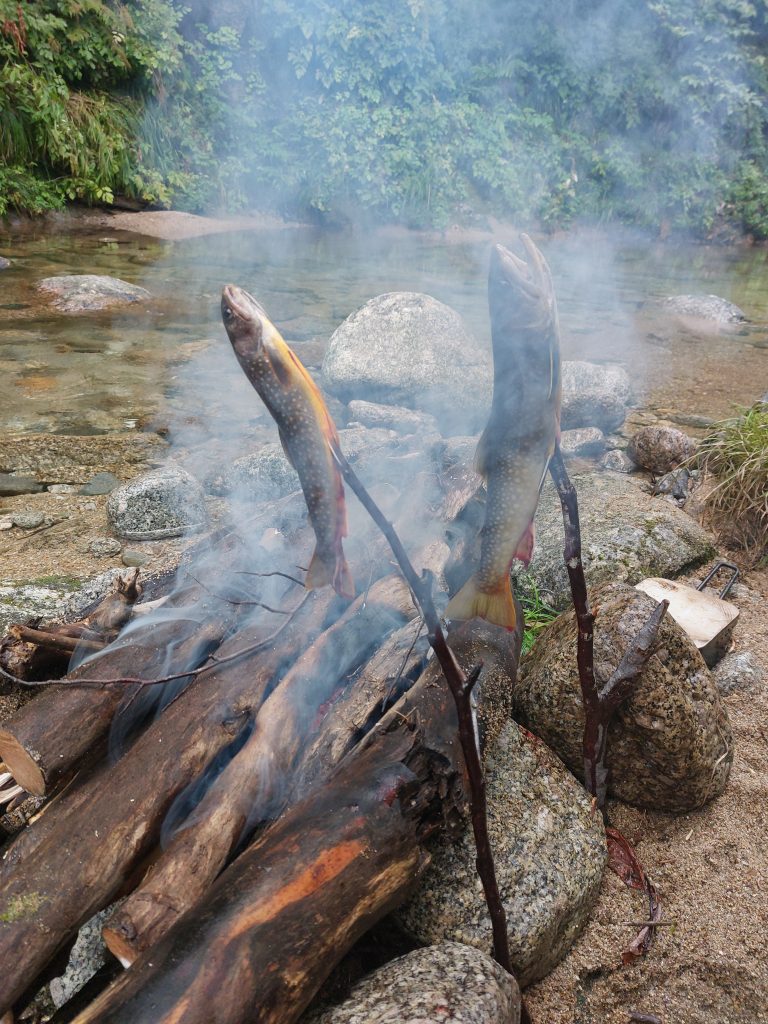 途中で頭上の木に毛鉤を引っ掛け、紛失してしまった。2個しか毛鉤を持っていなかったので、あと1個。まだ2匹しか釣れていないが、43cmの大物がいるので十分だろう。異様に湿った薪で焚き火を起こし、どちらも塩焼きにしてみた。