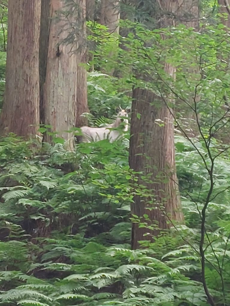 下山中、カモシカの親子に遭遇。普通のカモシカより白く、神々しさを感じる。子供も白かったので遺伝なのだろう。良い事が起きそうな気がした。