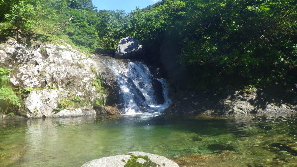 しばらくはナメが続き、難所と呼べるところは何もない。昨日の連瀑帯で一気に高度を上げたからか、穏やかな渓相になった。これならもう少し先でビバークしても良かったかと思う。次々登場する癒しの滝と釜。上流部も水量はそこそこ多く、イワナ達が優雅に泳いでいた。