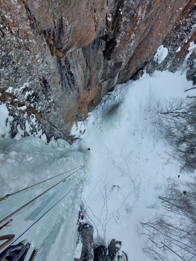 これまで登ってきた氷なので強度は十分と思われますが、崩壊すれば50M下の地面に落下。確実にミンチになるでしょう。