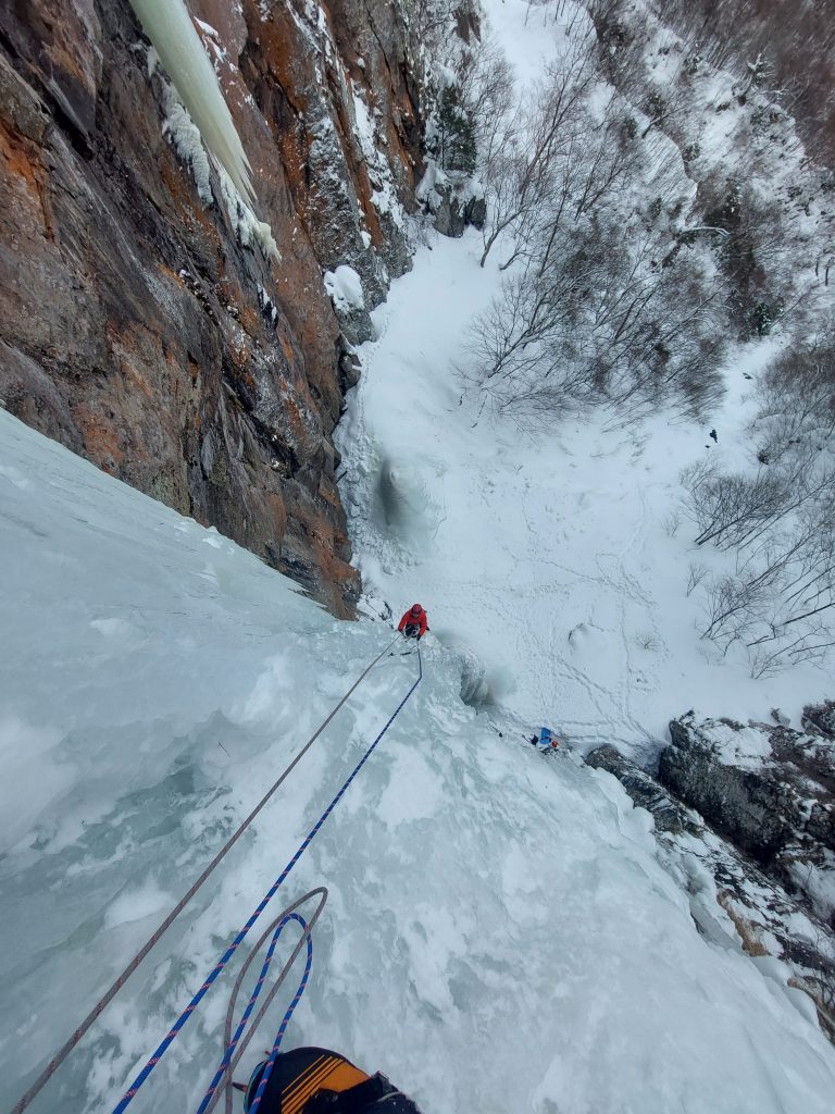 ガチ落ちする事がないフォローとはいえ、落氷などの危険もゼロではない。経験したことがない高難度の氷瀑に、四苦八苦しているようです。