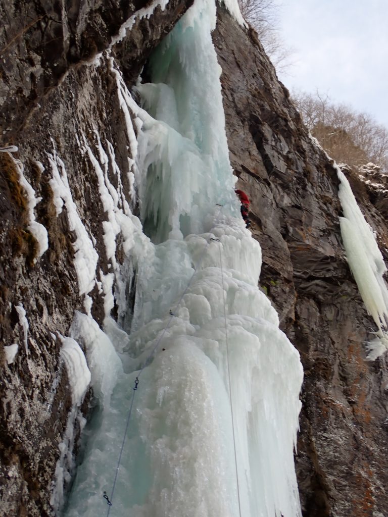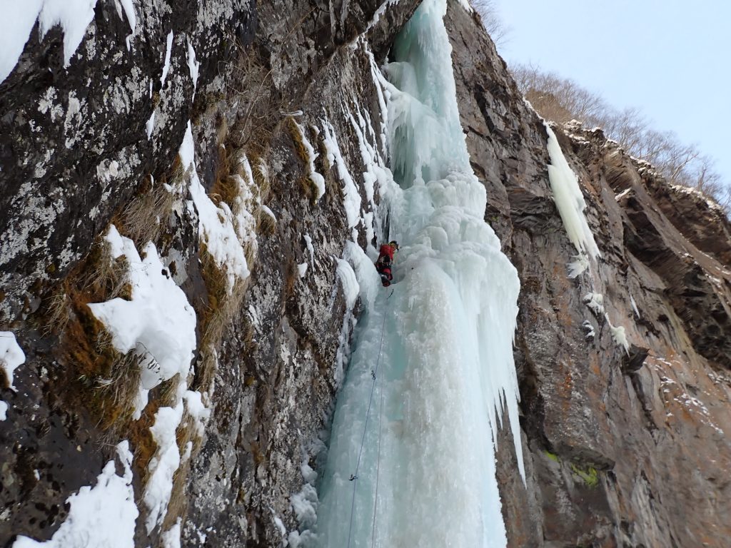 グレードはⅤ-なので、八ヶ岳の南沢大滝よりちょっと難しい感じです。全体的に見ると傾斜は緩いものの、バーティカル部分が多くクライマーの数も少ないので難易度高め。