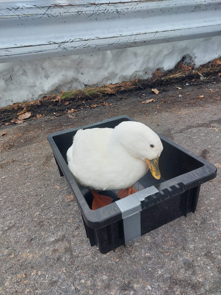 前に停まってた車からアヒルが出てきてビックリ。飼い主と車泊しながら1か月近く山スキーのお供をしているそうです。