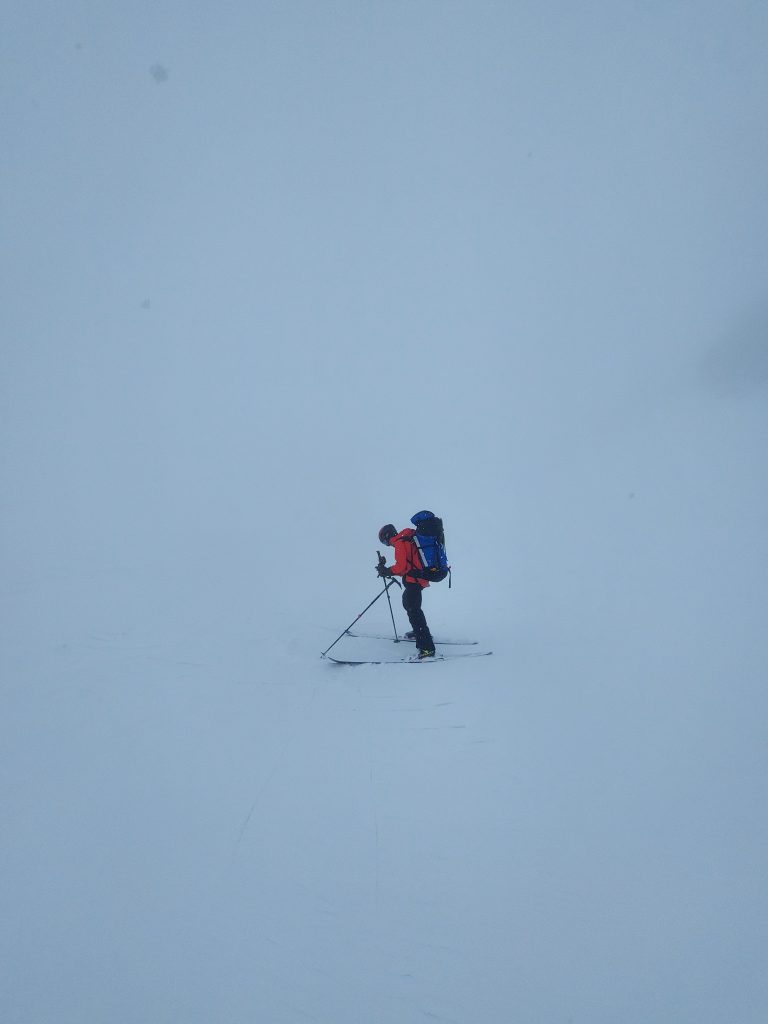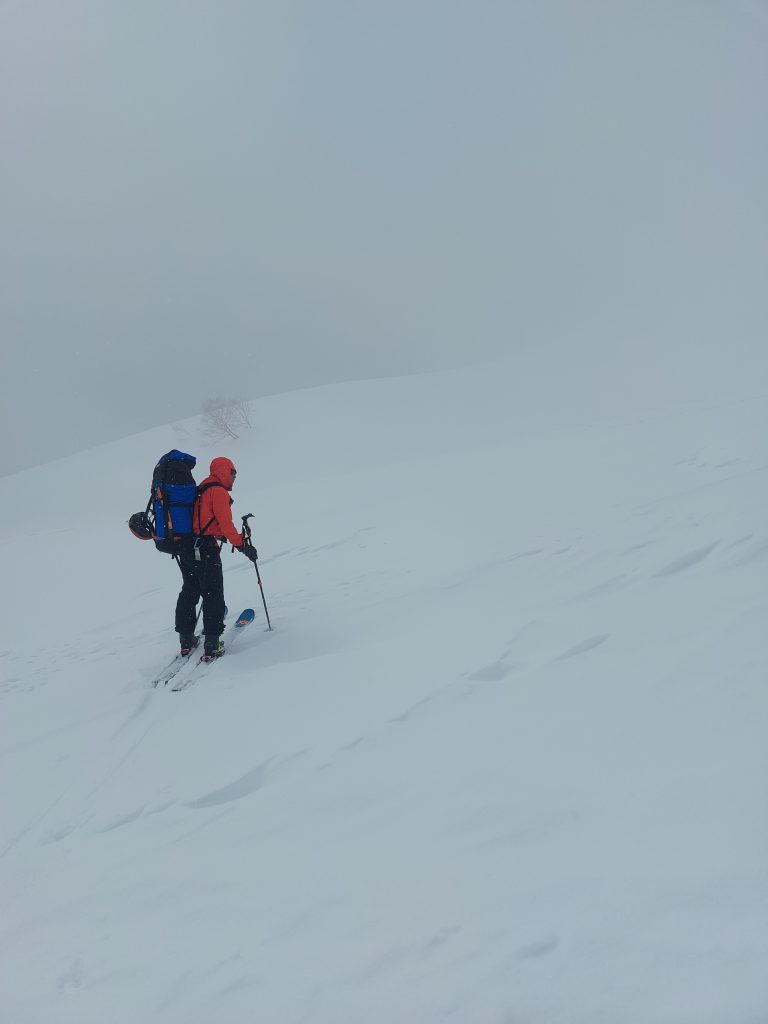 視界が悪い上にとにかく固い雪。クトーを持ってきてないのでなかなか大変です。ちょっと滑ったら滑落必死。