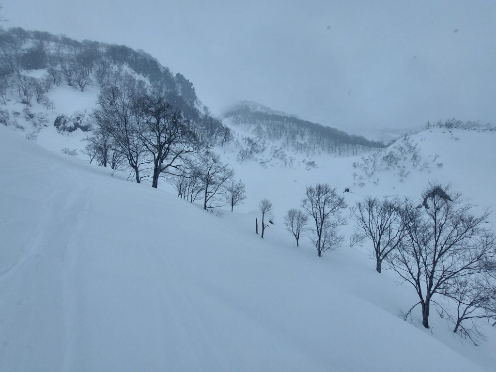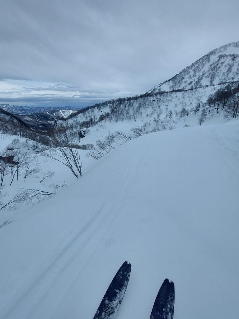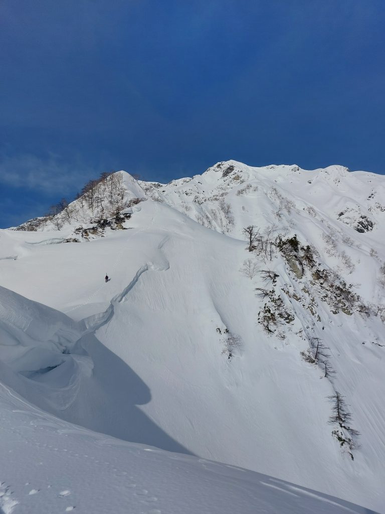 更に尾根の両端が40~60度くらいの雪渓になっているのでスキーがあればどこでも脱出できそうです。