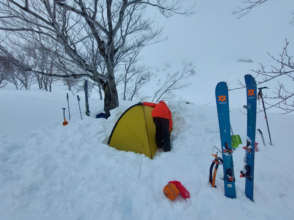 雪が安定しているので雪崩はないと思いますが、一応高台にテントを張りました。