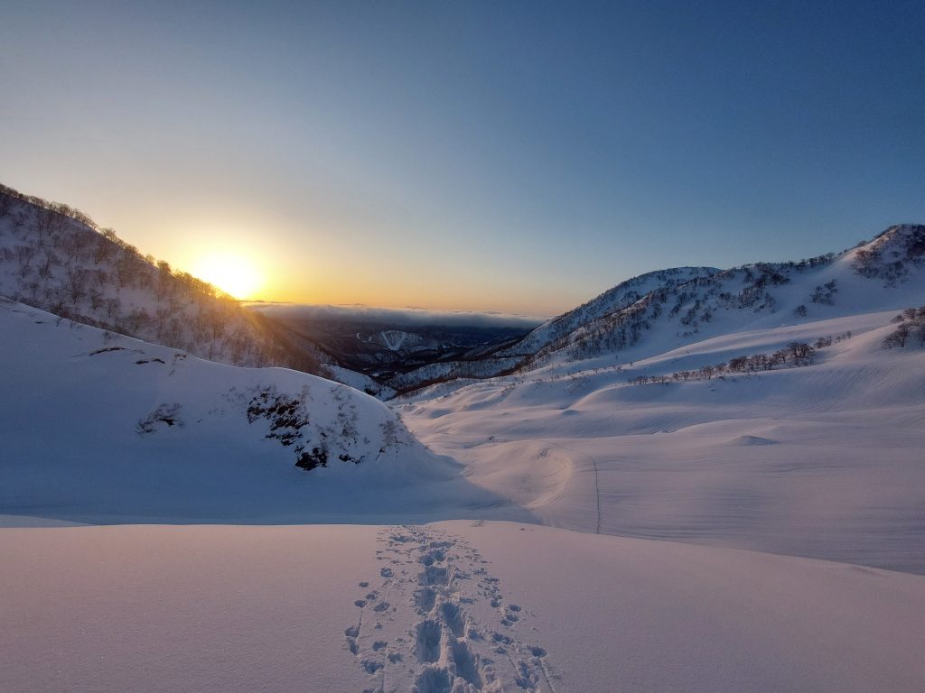 出遅れた上に雪が多く、山頂まで行けるかはかなり怪しいですが、この朝日を見ただけでも価値はある気がします。
