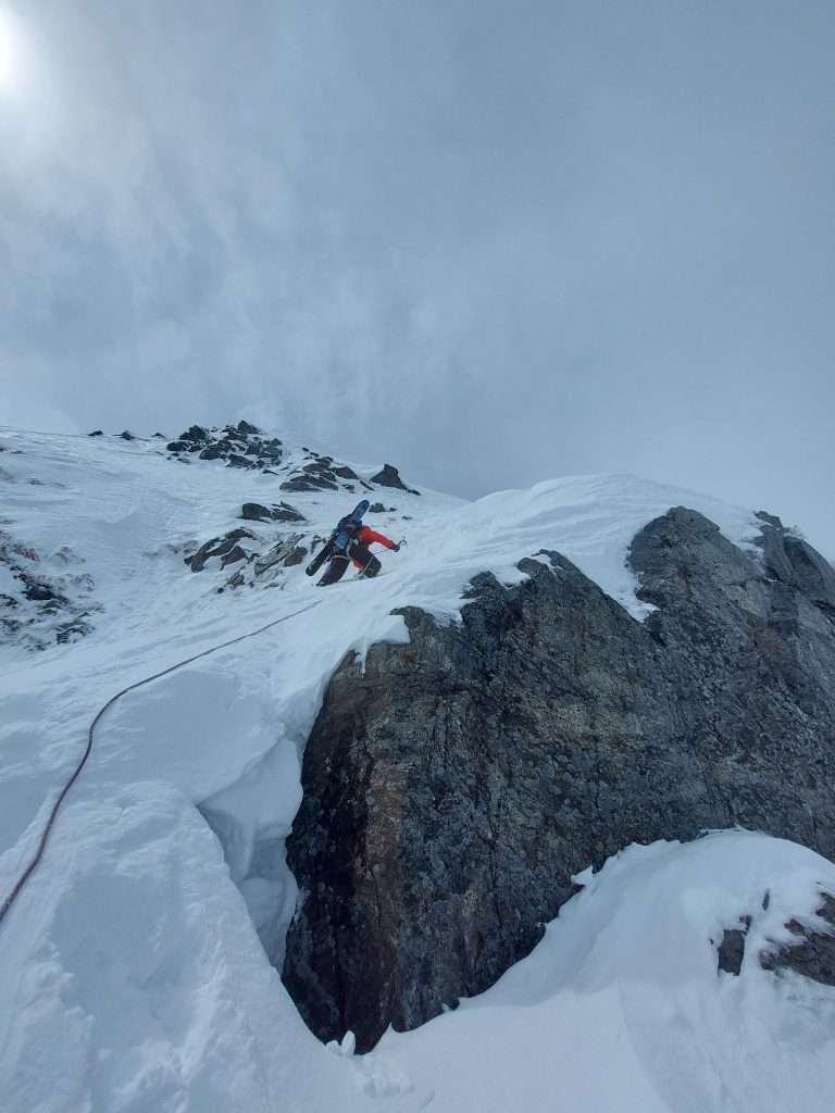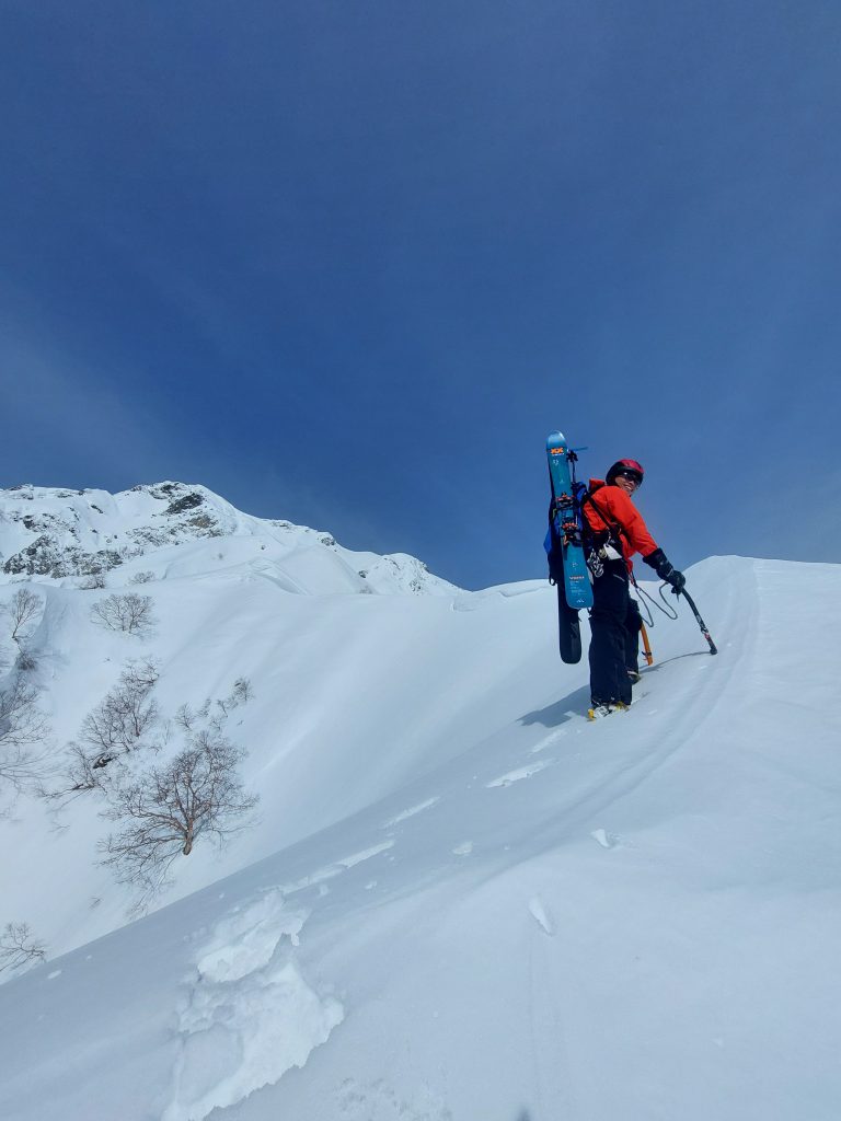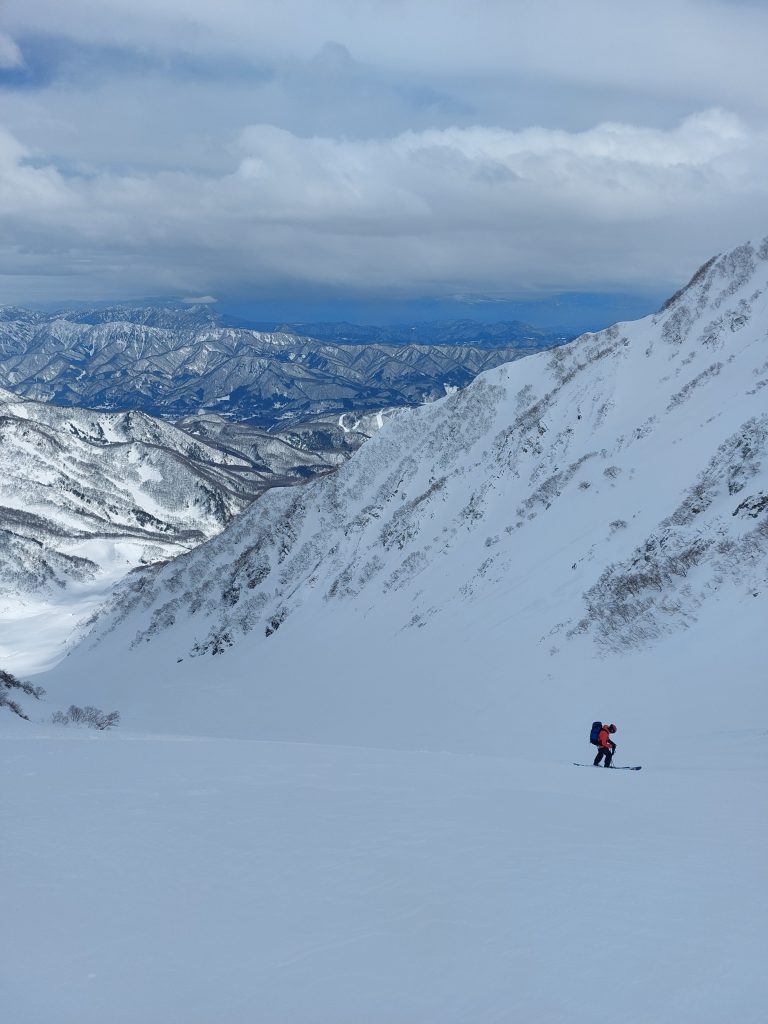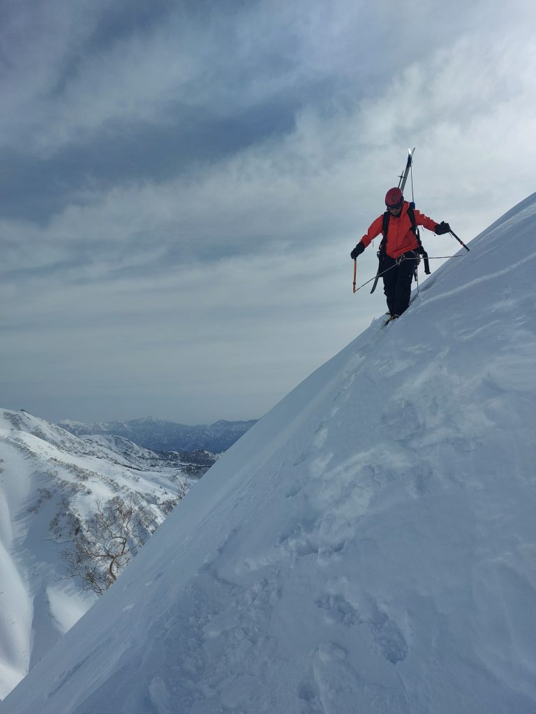 とはいえロープを出すと時間がかかるので、もし滑落したらもう片方がスキーで助けに行くということで決定しました。まぁしっかり蹴り込めばステップが作れるので(たぶん)落ちません。
