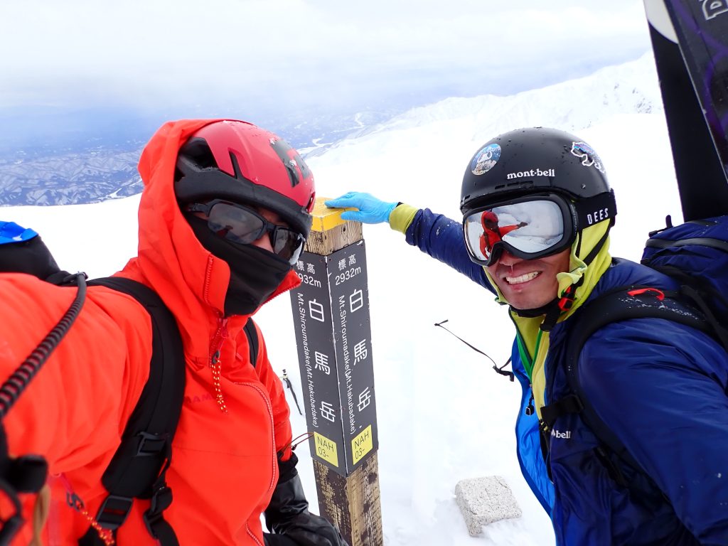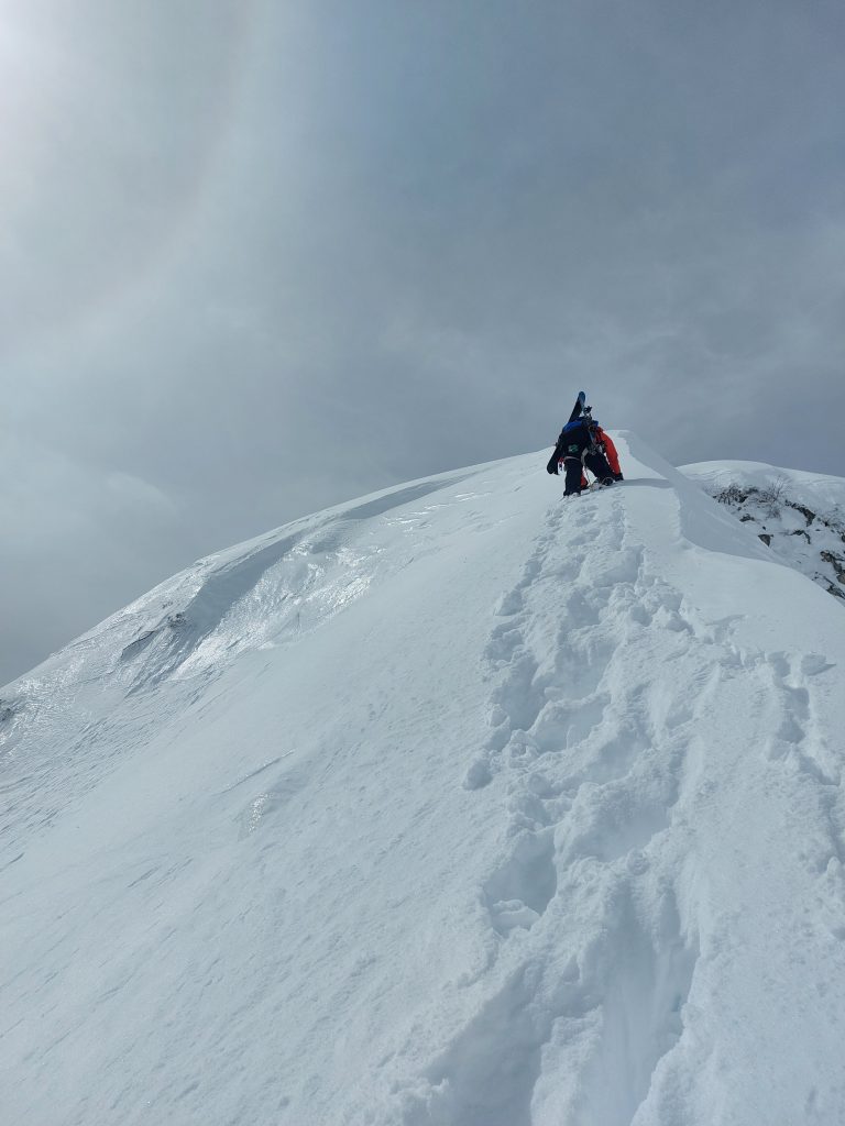 傾斜は約70~80度、雪の表面が固くボロボロと崩れる。おまけに山頂は強風で、スノーシャワーが降り注ぎます。