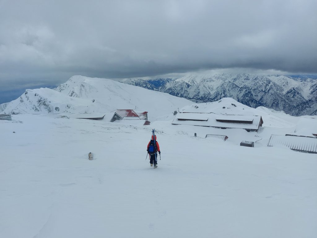 徒歩なら1.5~2時間かかる大雪渓の下山ですが、スキーならわずか20分。