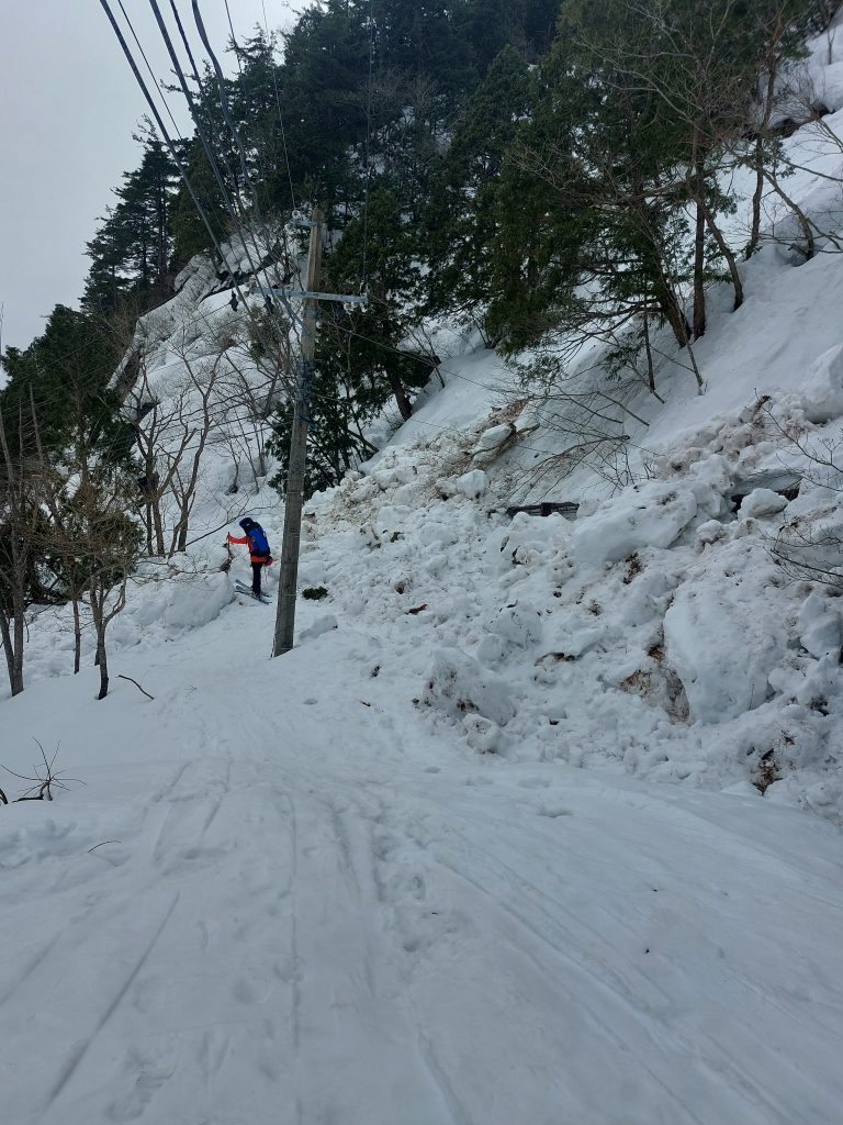 林道終了あたりですが、気温が急上昇したせいかデブリができてました。